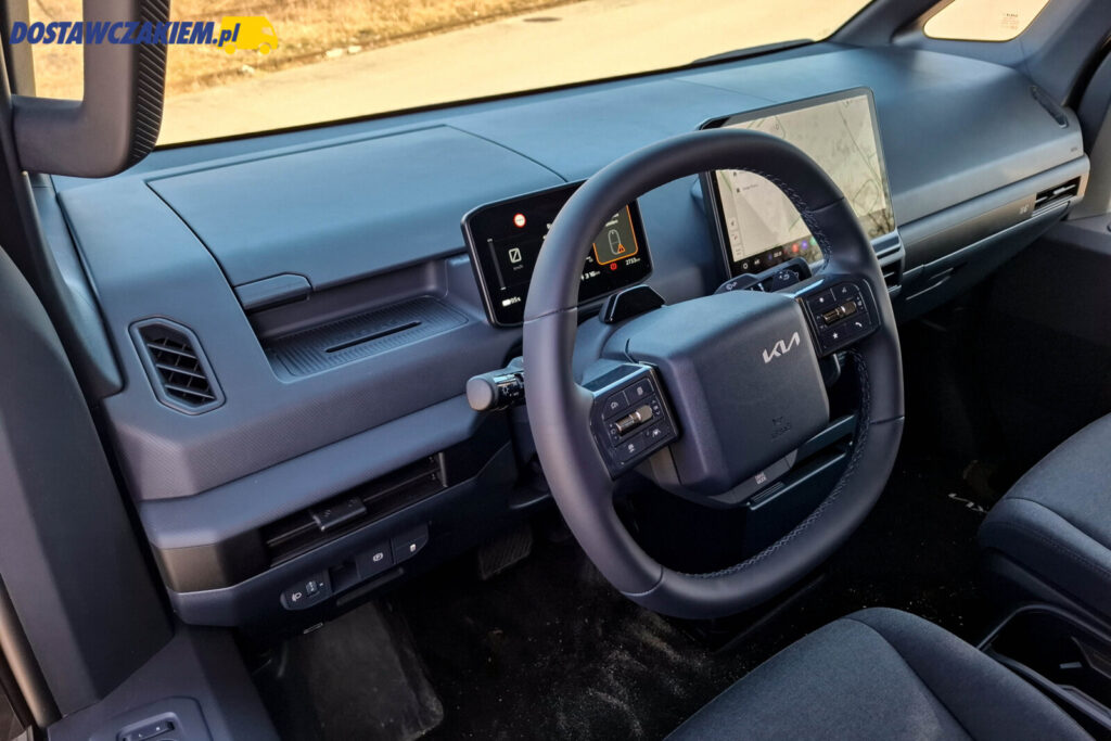 Muszę uczciwie przyznać, że Kia PV5 Cargo zrobiła na mnie bardzo pozytywne wrażenie. Miękkie podłokietniki na drzwiach kierowcy i pasażera czy lusterka z zasuwką w obu osłonach przeciwsłonecznych oraz gruby wieniec kierownicy obszytej skórą to elementy znane powszechnie może w osobówkach, ale nie w użytkowych vanach.
