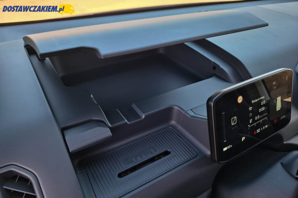 Rewelacyjna responsywność układu kierowniczego, dobrze spasowane materiały wykończeniowe i spora przestrzeń w kabinie to kolejne atuty Kii PV5 Cargo. Przydałyby się oczywiście fizyczne przyciski do obsługi nawiewów/klimatyzacji, ale poza tym nie ma co narzekać.