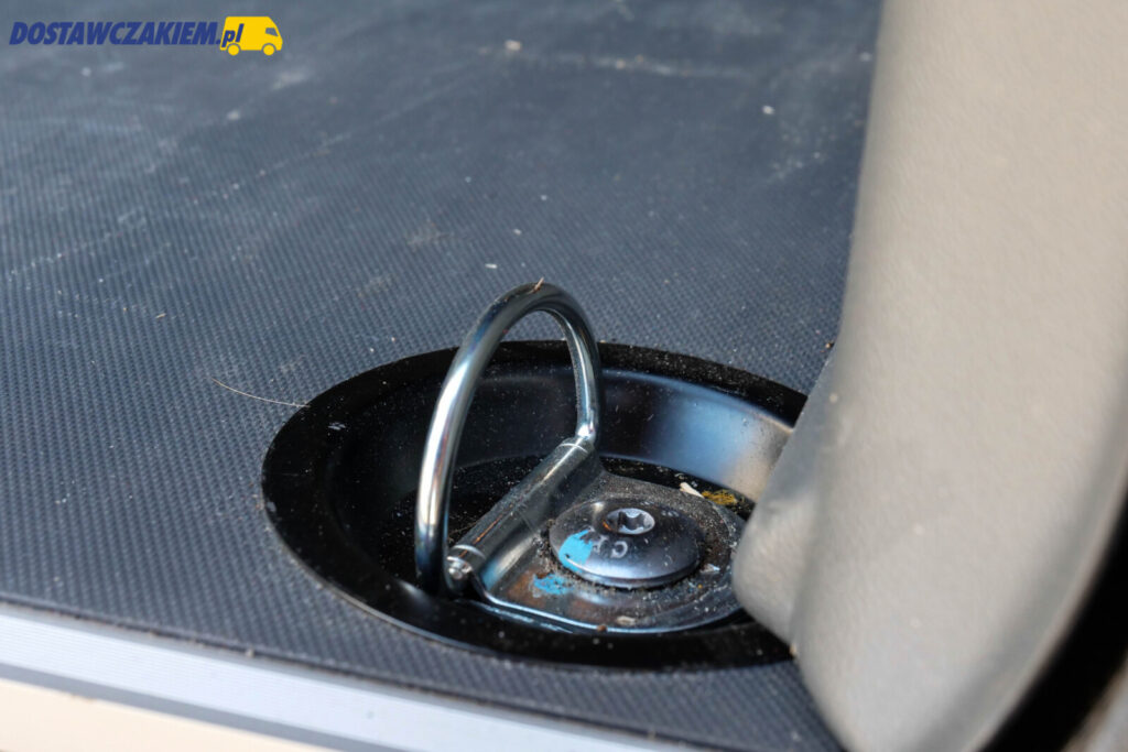 Wysokość progu załadunkowego nieobciążonej „blaszki” to nieco ponad 600 mm a wariant L2, czyli tzw. Long oferuje 8 punktów mocujących osadzonych na podłodze ładowni. I tutaj mała uwaga: jeżeli załadujemy 3 europalety z towarem, to ostatnia paleta przy tylnych skrzydłach może nachodzić na umieszczone tam uchwyty z „uszami”.