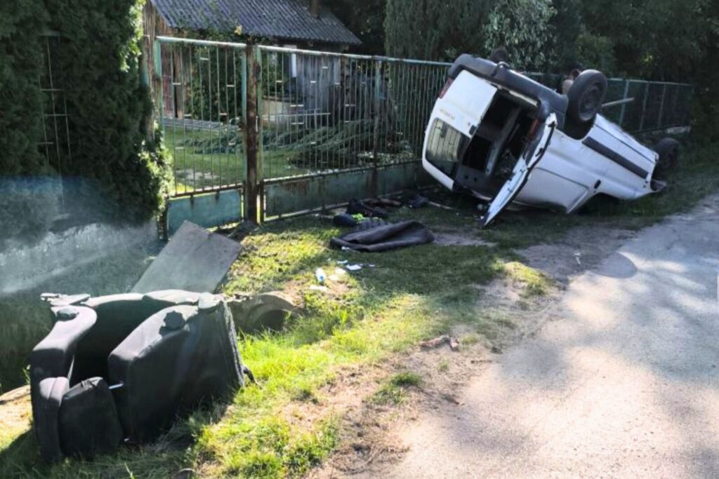 W Ożarowie dachował dostawczy Peugeot Partner. Do kierowania przyznali się jadący vanem kierowca… i kobieta – oboje byli mocno nietrzeźwi.