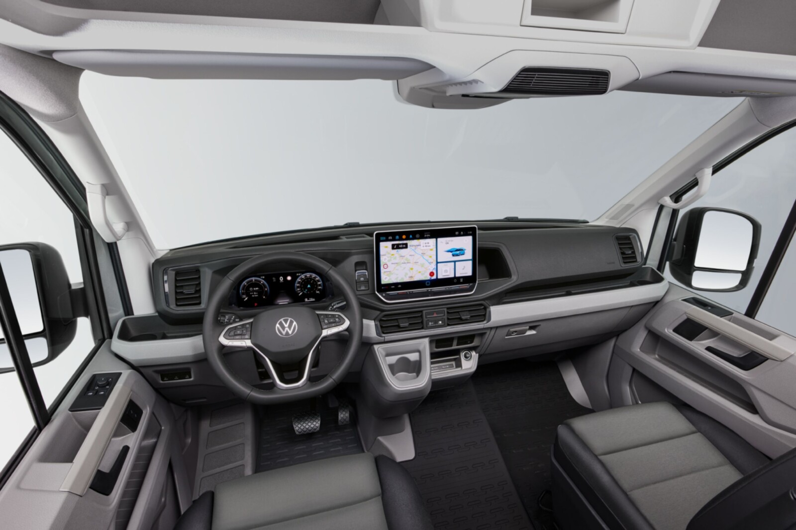 Po faceliftingu Crafter otrzyma m.in. całkowicie nową deskę rozdzielczą z cyfrowym zestawem wskaźników. Centralny dotykowy wyświetlacz będzie mieć przekątną 10,3 cala lub 12,9 cala.