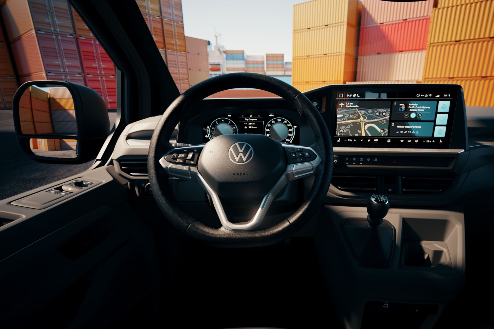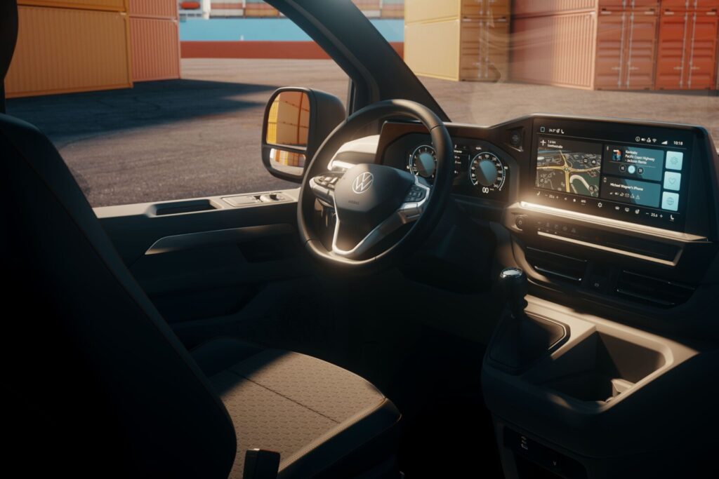 Nowy VW Transporter będzie seryjnie wyposażony m.in. w 13-calowy wyświetlacz na desce rozdzielczej, elektroniczny hamulec postojowy z funkcją Auto Hold oraz wielofunkcyjną kierownicę czy asystenta pasa ruchu.