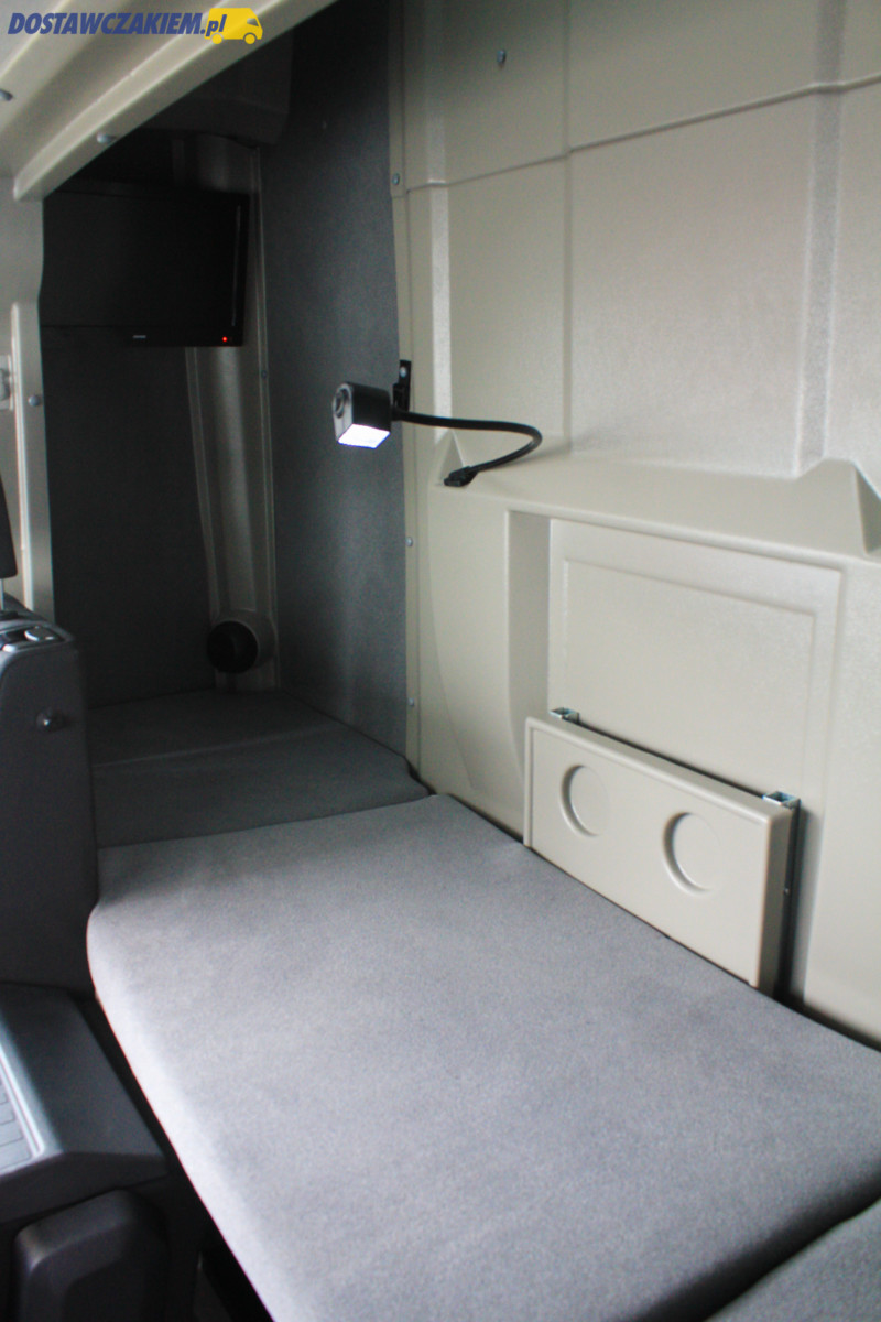 Biały bus otrzymał przestrzeń sypialną za fotelem kierowcy Spojtrak, a w ramach opcji kabina wyposażona została dodatkowo w telewizor oraz okno dachowe.