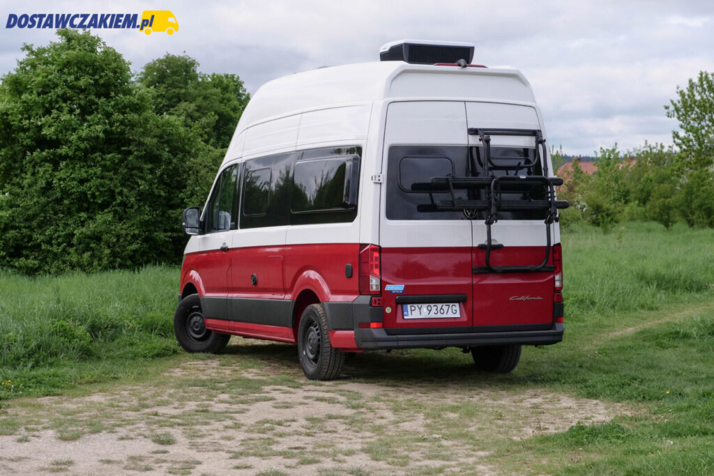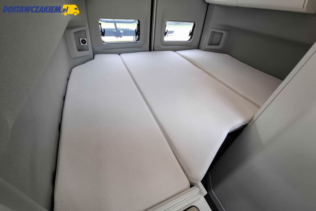 A jak się mieszka w takim campervanie? Po pierwsze oferuje on miejsce do spania dla 4 osób. Więcej przestrzeni do odpoczynku znajduje się w tylnej części Volkswagena – ma on 193 cm na 136 cm i zmieszczą się tam faktycznie dwie dorosłe osoby, aczkolwiek jednak lepiej ulokować tam jednego większego dorosłego z dzieckiem.