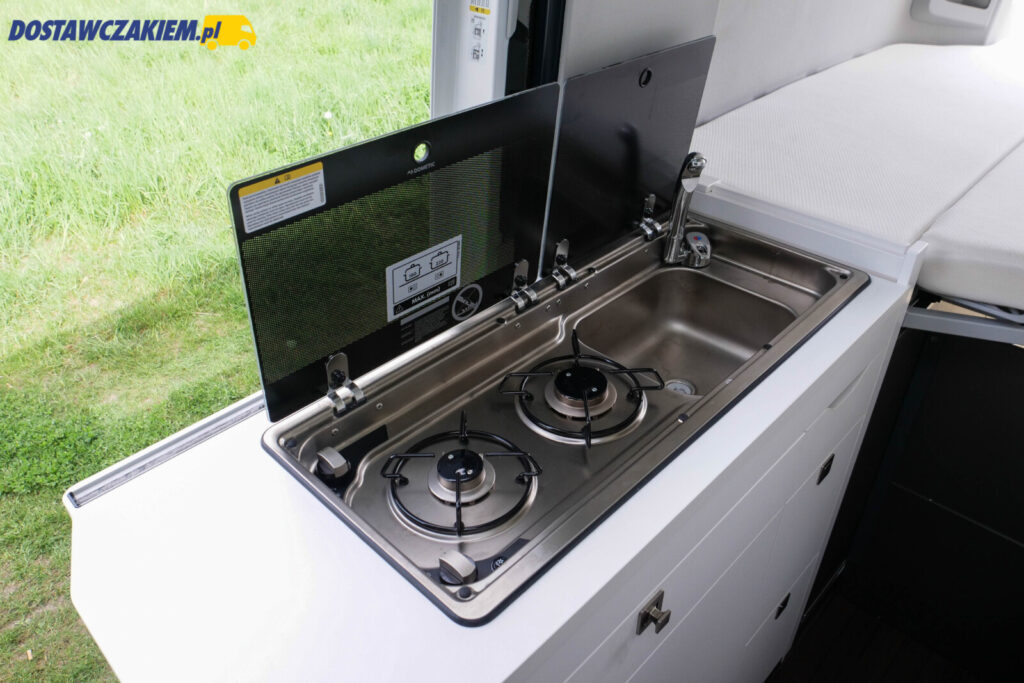 W serii znajdziemy także 2-palnikową kuchenkę gazową oraz 1-komorowy zlew a także 70-litrową lodówkę z zamrażalnikiem. Do tego w Grand Californii mamy sporo gniazdek do ładowania USB-A i kilka punktów świetlnych przydatnych nie tylko w nocy. Są i szafki podwieszone nad tylnym łóżkiem oraz szuflady pod kuchenką.