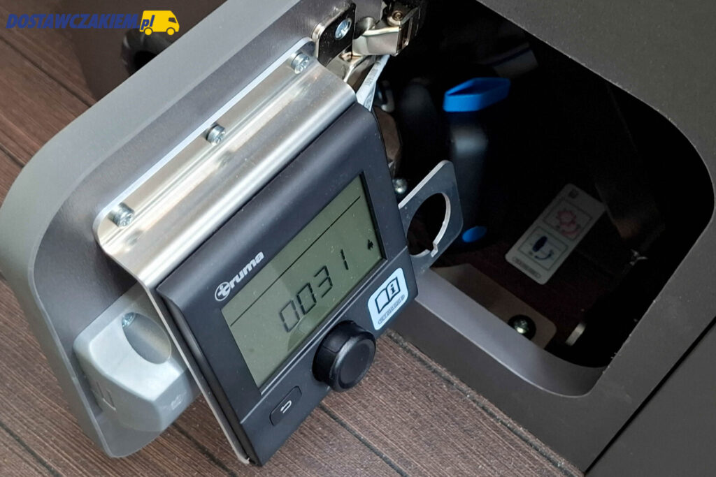 Warto też dodać, że pod podwoziem zamontowano 110-litrowy zbiornik świeżej wody oraz 90-litrowy zbiornik na wodę „szarą” a poziomy ich napełnienia można sprawdzić na kolorowym wyświetlaczu jednostki sterującej umieszczonej na ściance za oparciem „kanapy”.