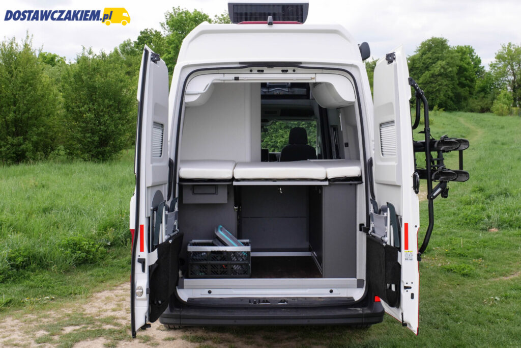 Z tyłu pod łóżkiem zmieścimy też sporo rzeczy, włącznie z dwoma rowerami dla dzieciaków, bo dwa kolejne dla dorosłych można przewieźć już na zewnętrznym bagażniku zamontowanym na prawych skrzydłach.