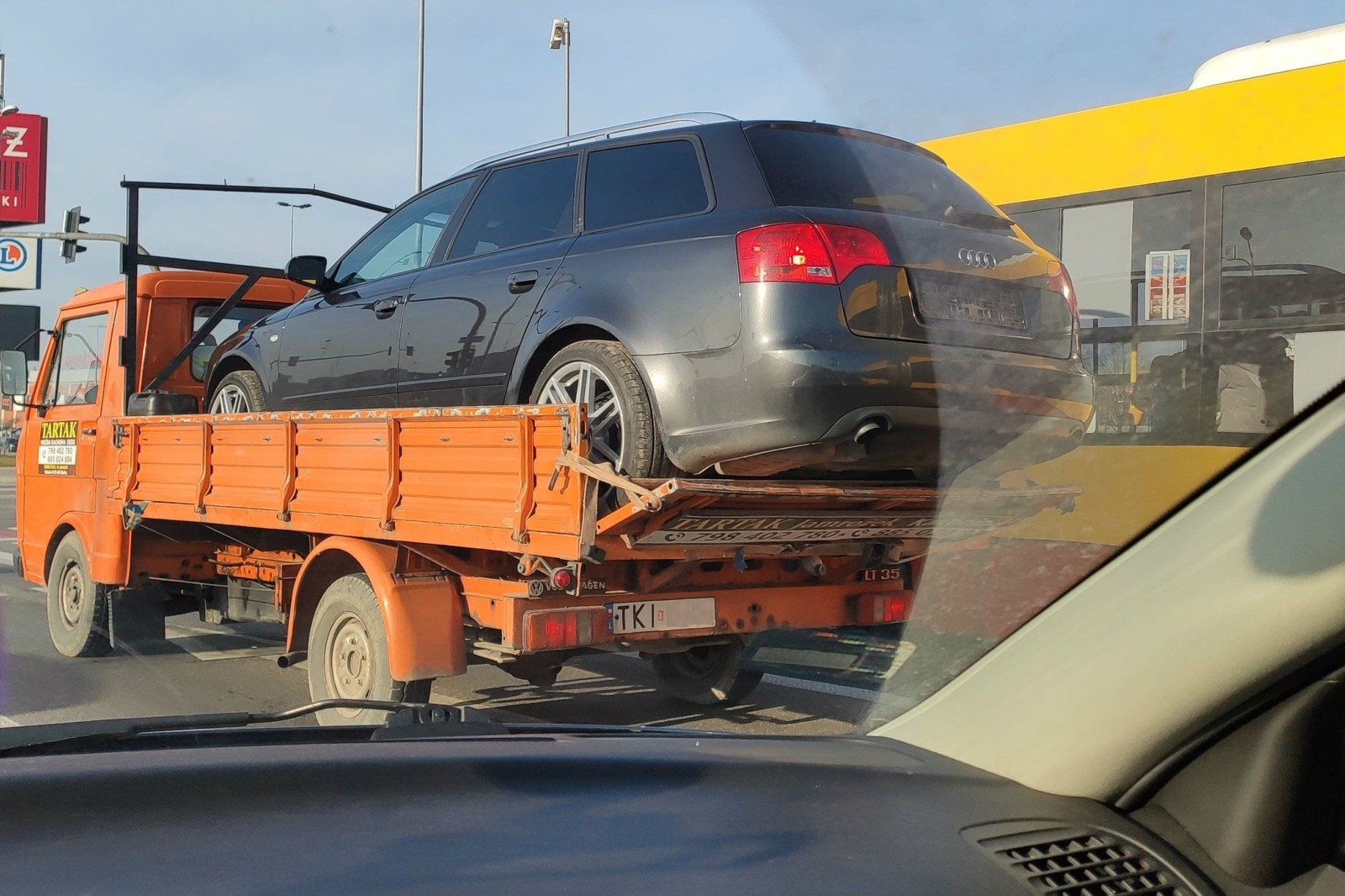 Widać na nim Volkswagena LT35, który przewoził na skrzyni ładunkowej Audi A4. Według Piotra, co też widać na zdjęciach, jedynym zabezpieczeniem osobówki była tylna burta skrzyni, którą związano pasami.