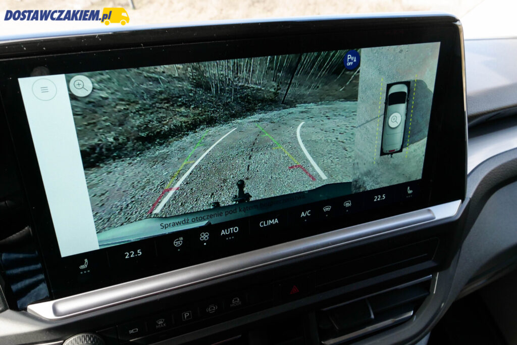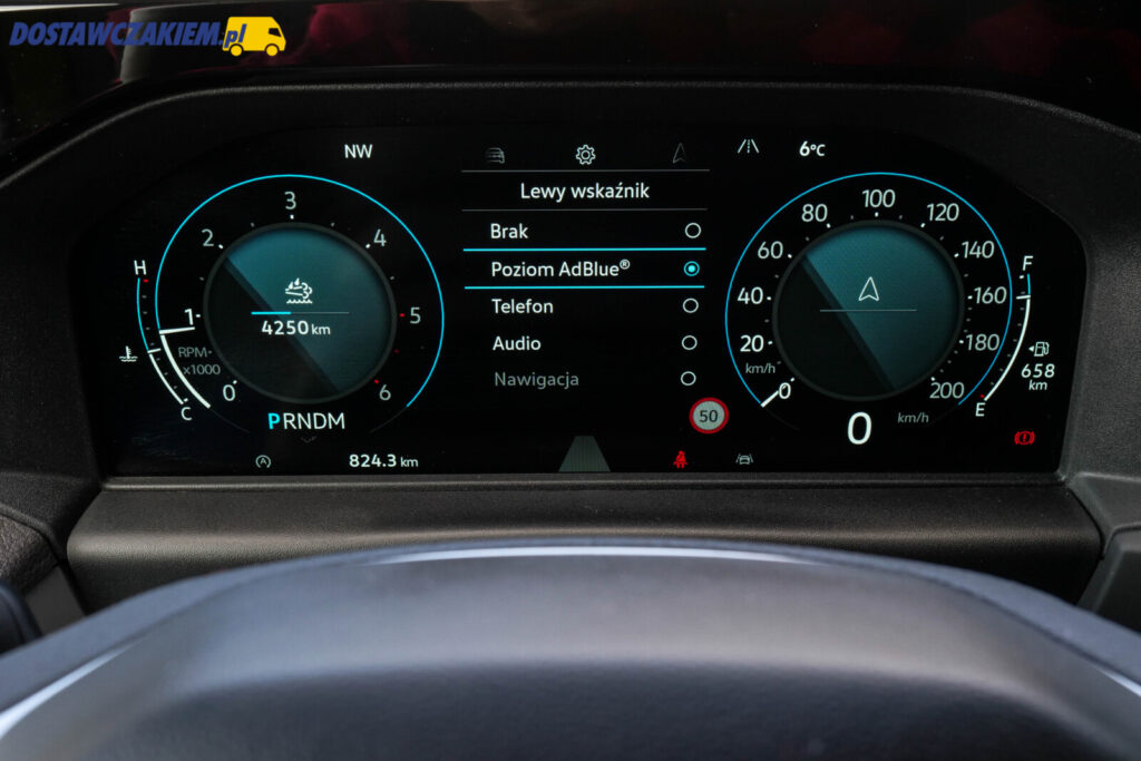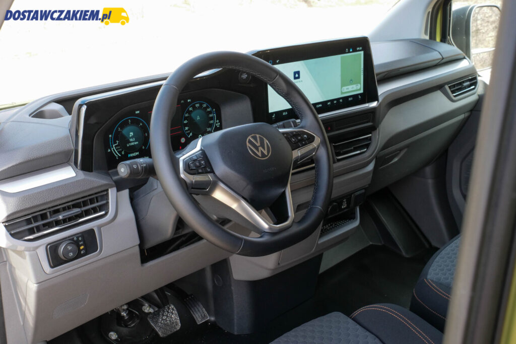 Deska rozdzielcza mocno przypomina tę z Transita Customa. Cyfrowy zestaw wskaźników jest jednak nieco inny i wypełnia w Transporterze całą przestrzeń. Nie udało mi się znaleźć w opcji natomiast możliwości wyświetlenia np. informacji o temperaturze oleju silnikowego a da się to zrobić w Crafterze. Szkoda.