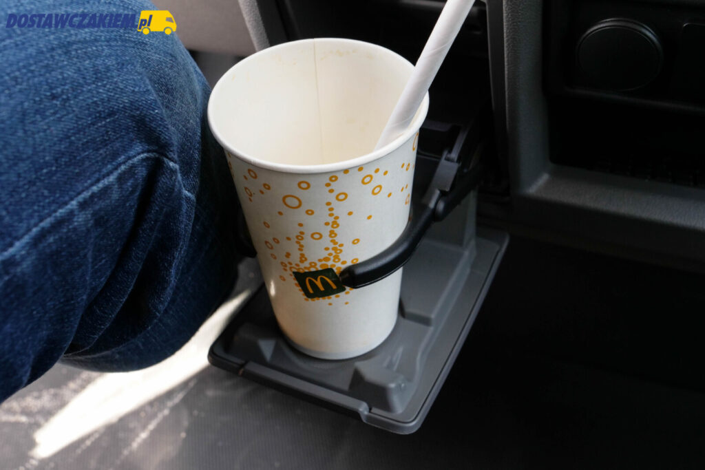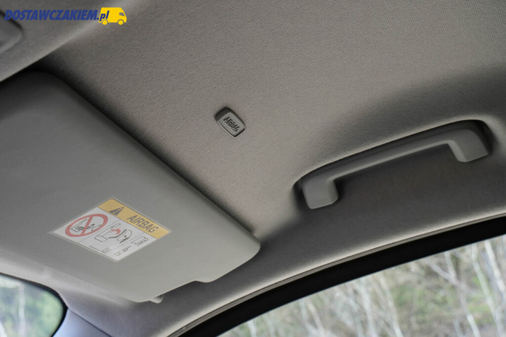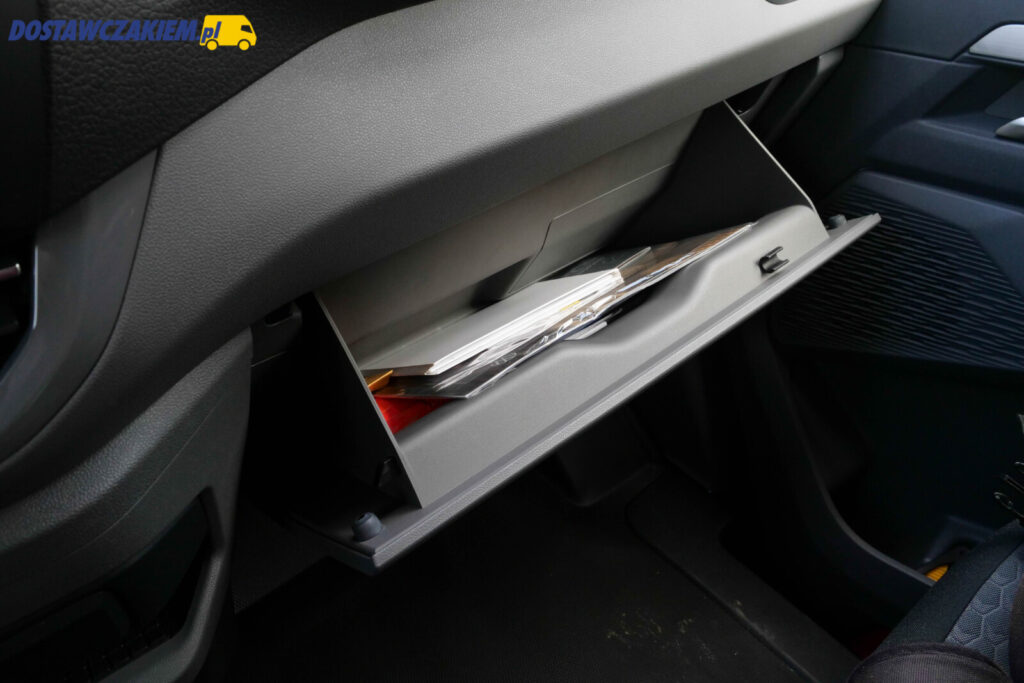 Pod względem miejsca jest nieźle a i miejsce na butelkę, faktury, „WZ-tki” też się znajdzie. Ciekawym rozwiązaniem jest umieszczenie poduszki czołowej powietrznej pasażera/pasażerów nie w desce rozdzielczej a w podsufitce. Dzięki temu wygospodarowano miejsce na zamykany schowek także na górze kokpitu przed pasażerami, bo ten zamykany dolny schowek pomieści może kamizelkę odblaskową, długopis (jest specjalny uchwyt) i z dwie paczki chusteczek.