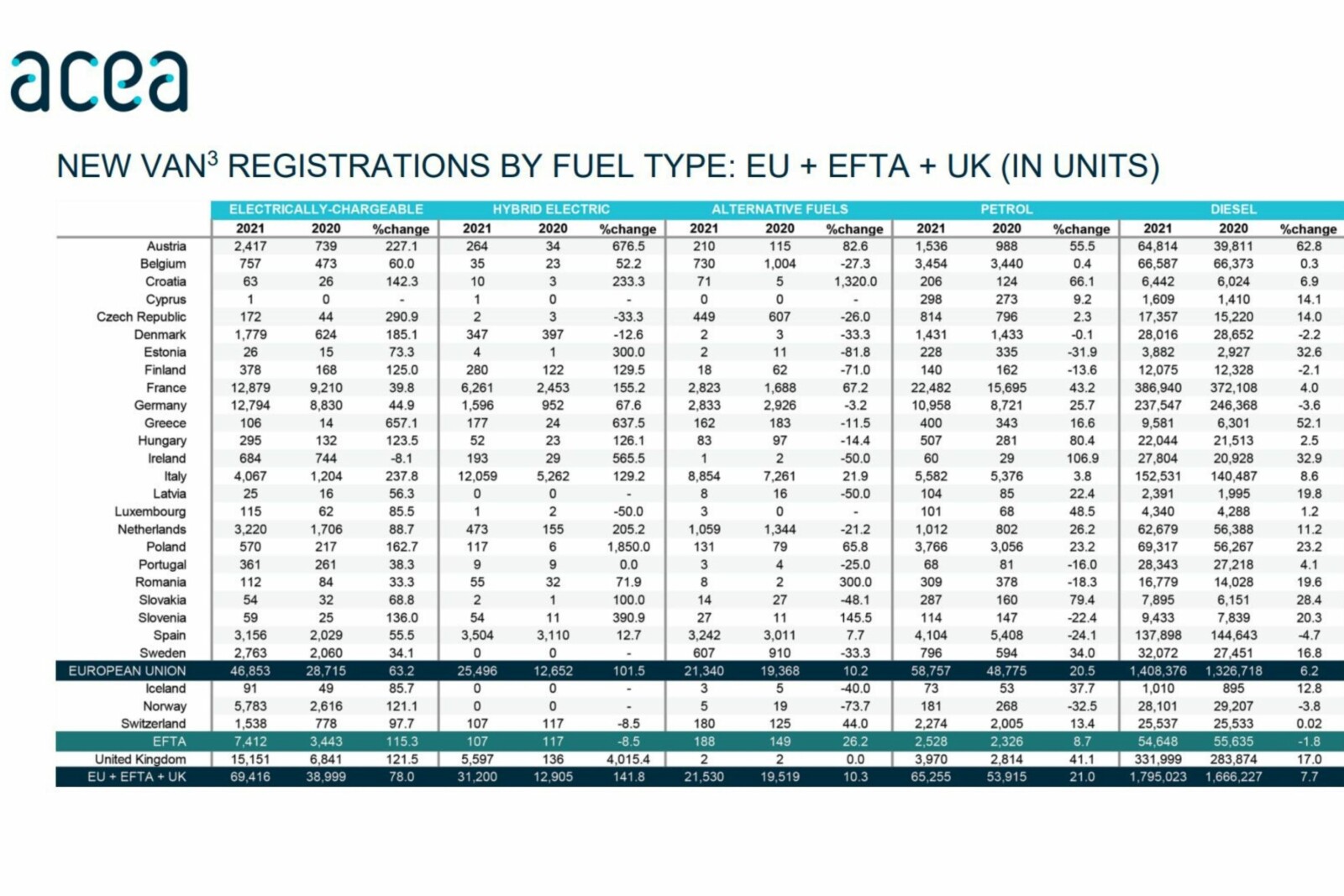 Według ACEA W Polsce w 2021 roku wydano klientom 73 901 nowych pojazdów użytkowych z DMC do 3,5 tony, z czego 69 317 (93,8%) z nich napędzanych było silnikami wysokoprężnymi a 3766 (9,1%) posiadało jednostkę benzynową.
