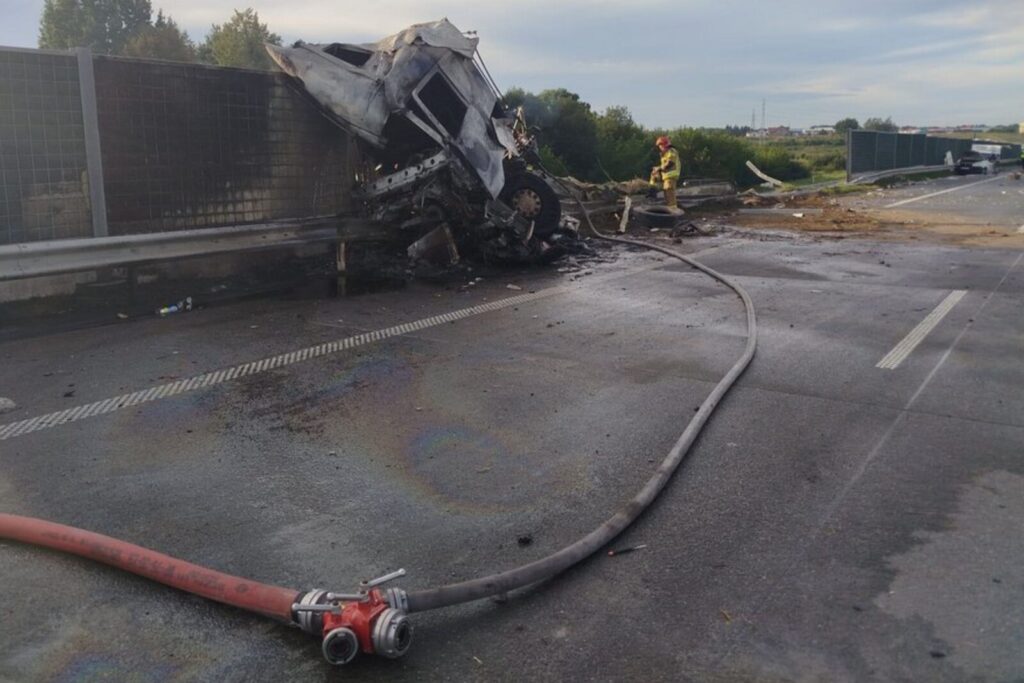 Zmiażdżone Doblo i spalona kabina ciągnika siodłowego – takie sceny miały dziś miejsce na „S5-tce” pod Bydgoszczą. Ranna została jedna osoba.