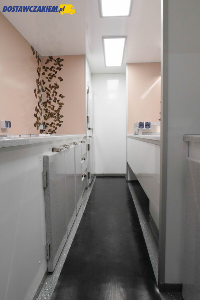 Podłoga oraz wysuwany tzw. wózek pokryty został blachą nierdzewną a przestrzeń oświetlały listwy LED – 2 pasy przy suficie i kolejne 2 w połowie wysokości zabudowy.