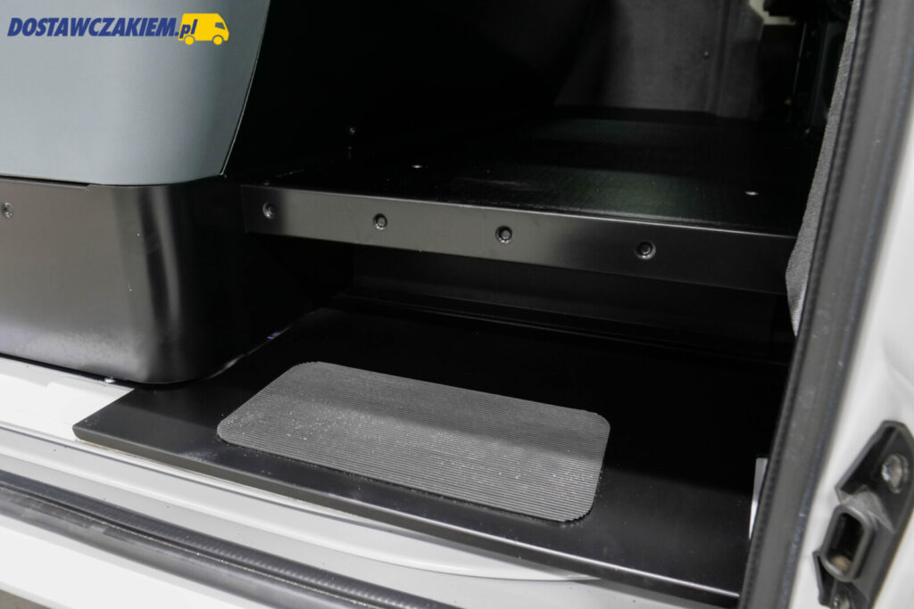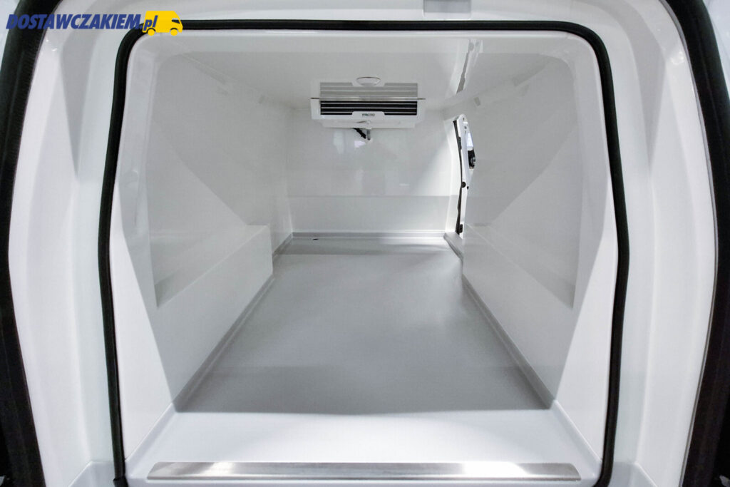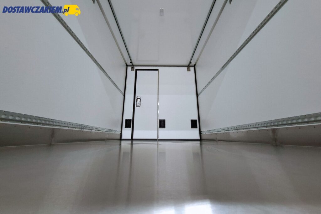 Izoterma wewnętrzna wykonana z dedykowanemu konkretnie pod ten model zestawu składa się z białego laminatu z warstwą izolacyjną oraz szarą podłogą antypoślizgową z odpływem po lewej stronie.