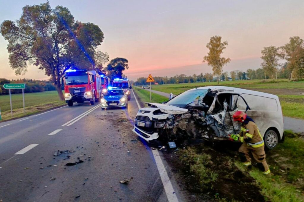 Początkowo informowano o dwóch osobach poszkodowanych, jednak ostatecznie do szpitala trafił tylko 46-letni kierowca furgonetki. Kierowca ciężarówki nie wymagał pomocy medycznej.