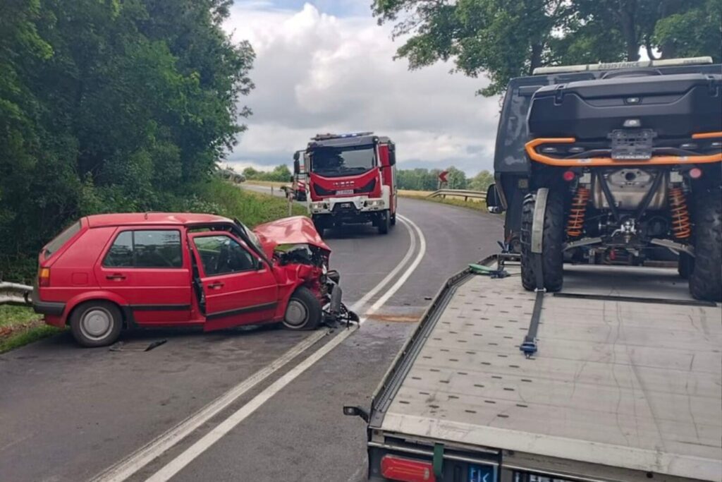 W wyniku zderzenia kierowca samochodu osobowego został zakleszczony w zmiażdżonej kabinie VW Golfa.