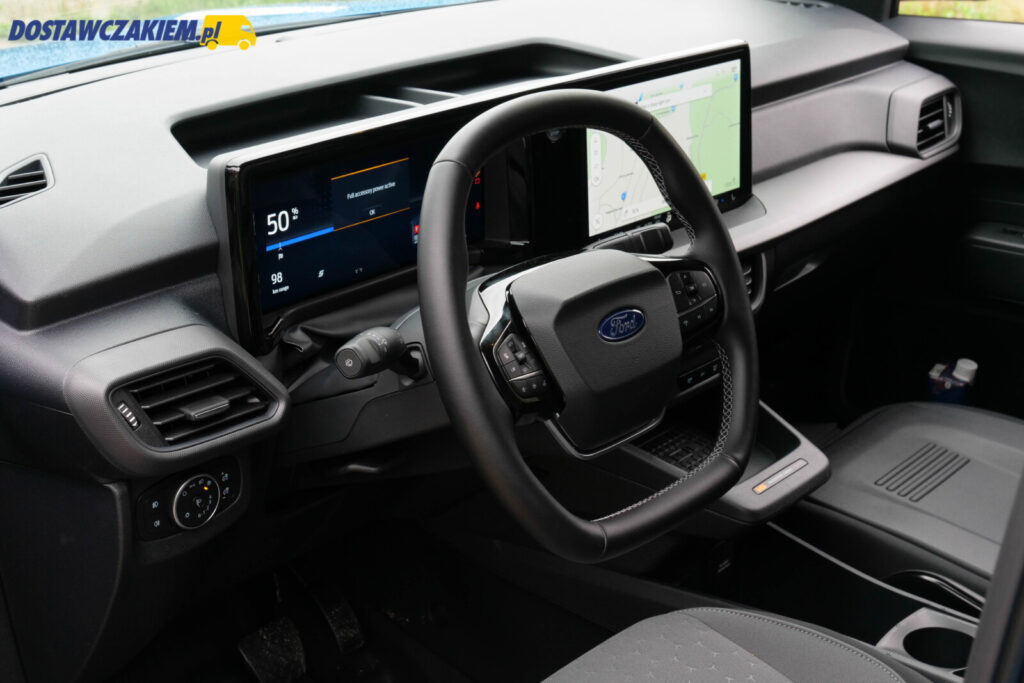 Wizualnie Transit z większą baterią nie wyróżnia się niczym od dotychczas występującego modelu z baterią 68 kWh a i w środku nie zauważyłem żadnej różnicy. W obu wersjach silnikowych kierowca ma do dyspozycji do 430 Nm.