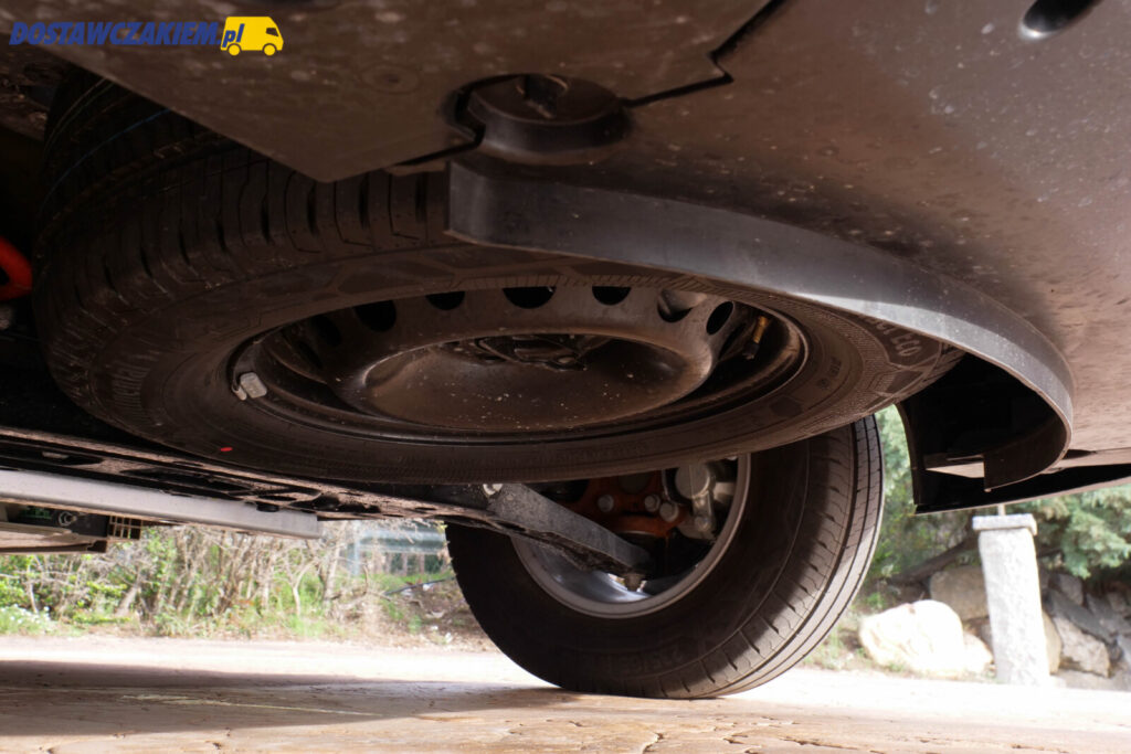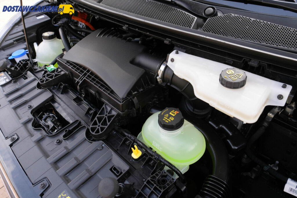 W ramach ciekawostki dodam, że E-Transit to pojazd tylnonapędowy – elektryczny silnik umieszczono przy tylnej osi a pod maską znajdziemy m.in. zbiornik płynu do spryskiwaczy, kompresor klimatyzacji oraz podwieszone od spodu koło zapasowe z „windą”.