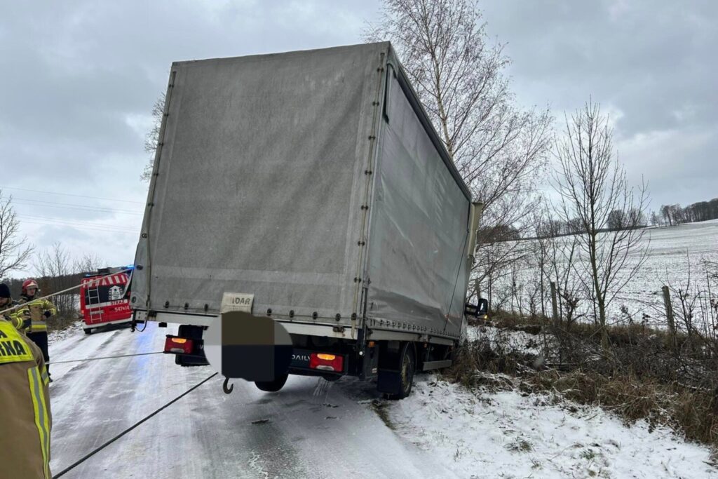 Oblodzona droga bywa mocno zdradliwa. Przekonał się o tym kierowca tej „międzynarodówki” na podwoziu Iveco Daily.