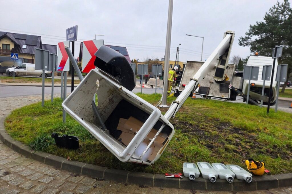 Groźne zdarzenie pod Kwidzynem. Podczas prac na rondzie podnośnik koszowy przewrócił się na prawy bok. Do szpitala trafiła jedna osoba.